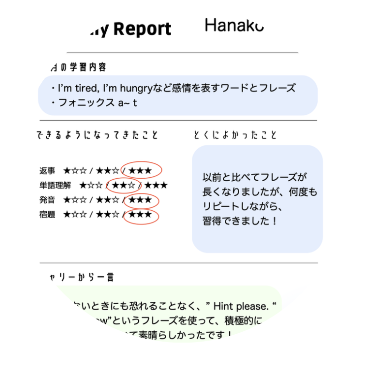 ご希望の方には、毎月親御さま宛てに月間レポートが届くので、一目でお子さんのレッスン進捗状況をご確認いただけます♪